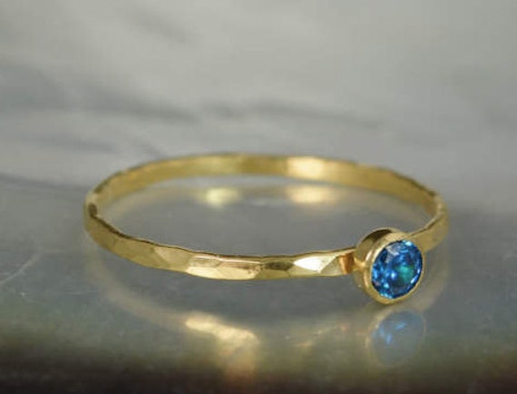Dainty Solid 14k Gold Blue Zircon Ring, 3mm gold solitaire,...
