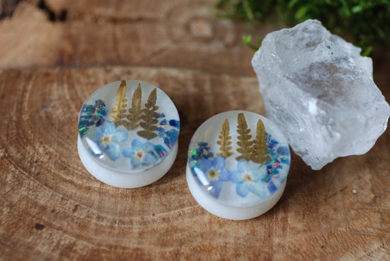 These double flared ear plugs are made of Eco Resin, a little magic forest made of real ferns and real pressed forget me not flowers. The beautiful iridescent color is added with black opal tiny stones.
