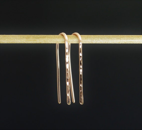 These earrings are handmade here in my studio. I use durable .95mm wide 14kt Rose gold-filled wire. The simple design has a very classic minimalist look. The front of the earring has a flat, hammered surface, and is about 1.5mm wide.