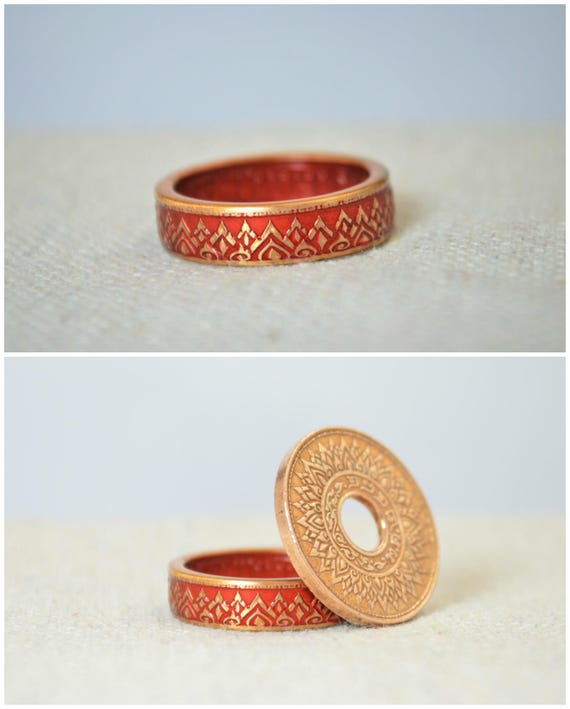 Thailand Coin Ring, Red Ring, Red Coin Ring, Crown Ring, Unique Ring, Red BoHo Ring, Coin Jewelry, Bohemian Ring, Thai Coin Ring, Thai Art by Alaridesign
