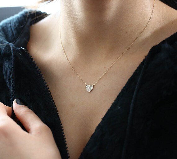 14K Solid Gold Heart Diamond Necklace/ Heart Shaped Diamond...