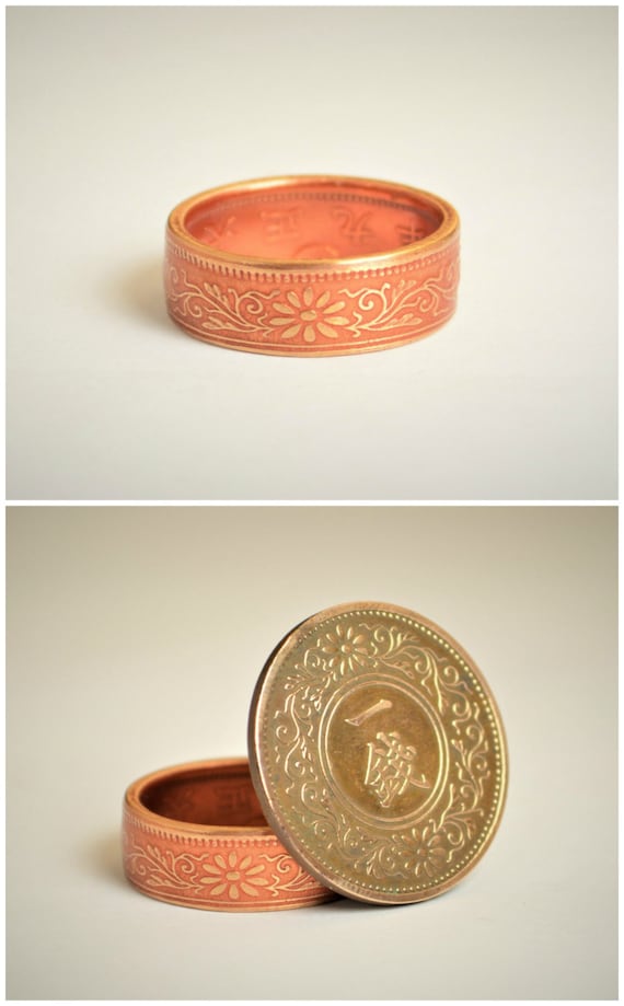 These rings are handcrafted using a bronze Japanese One Sen Coin. Issued from 1916 -1938 they feature a beautiful vine and cherry blossom design that will be on the outside of the ring. The inside of the ring features the date and issuing authority in Japanese script. You can see the coin these are made from in the first photo.