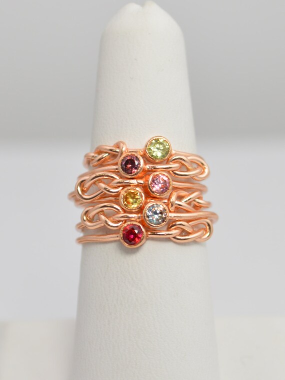 Buy these rings as mothers rings, BFF rings, or promise rings. The infinity knot represents love or friendship forever. These rings look great stacked together, the stones and knots nestle together for a remarkable set of rings.