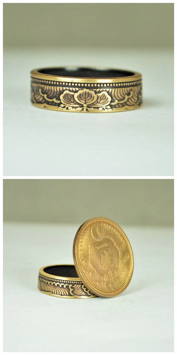 These rings are handcrafted using a rare brass Japanese One Sen Coin. Issued only in 1988 they feature a beautiful wave and cherry blossom design that will be on the outside of the ring. The inside of the ring features the date and issuing authority in Japanese script. You can see the coin these are made from in the first photo.