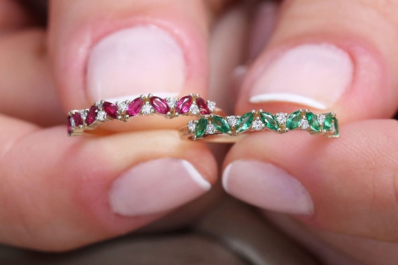 Marquise Emerald & Diamond Ring / Emerald and Marquise Diamond Wedding Ring in 14K Solid Gold / Alternating Emerald Marquise Gemstone Ring by FerkosFineJewelry