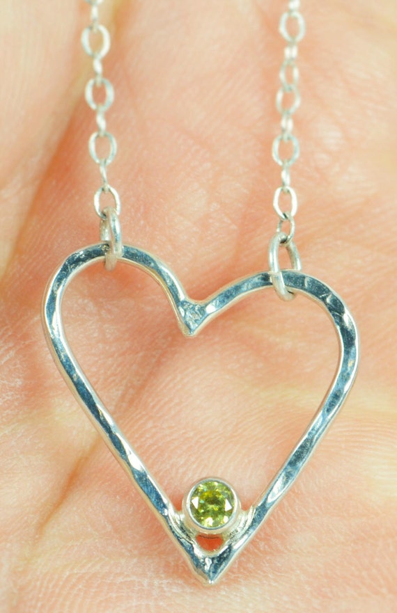 Minimal Rustic Necklace with a flash of sparkle & color. We completely fabricate the pendant in our studio. The sterling silver heart is hammered for interest.