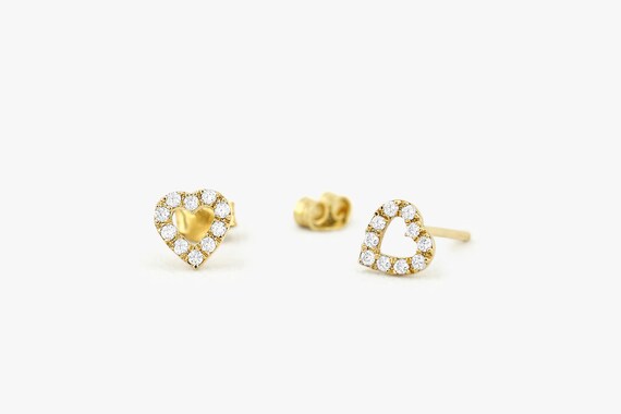 14K Gold Mini Heart Earrings with Round Cut Diamonds/ Micro Pave Earrings / Heart Shape Diamond Studs/ Minimalist Earrings by FerkosFineJewelry