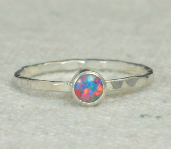 This petite multi-color opal ring makes a subtle modern fashion statement! This thin pure silver band is set with a 4mm man-made blue opal. This opal ring is beautifully worn alone or worn together in clusters with my other stacking rings.