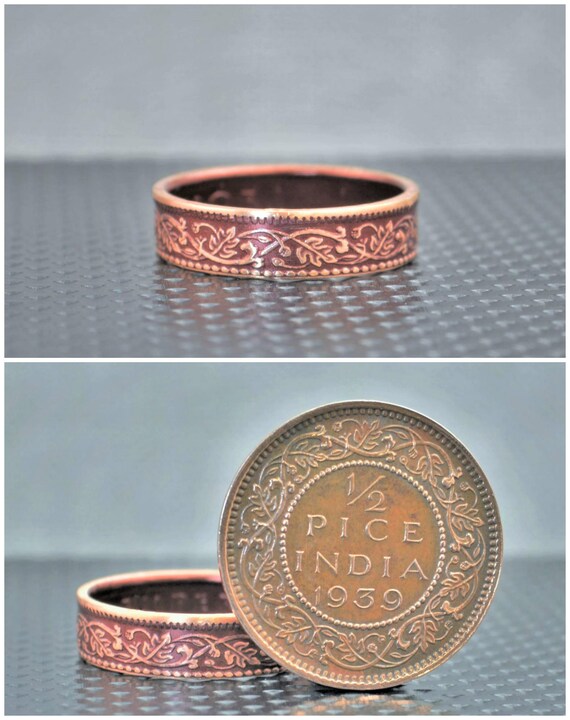 These rings are handcrafted using a bronze India-British ½ Pice Coin. This design was Issued from 1912-1936 they feature a beautiful wreath/vine pattern. The inside of the ring has the lettering: George V King Emperor. They were minted in Calcutta. You can see the coin these are made from in the third photo.