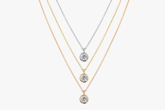 A single brilliant round cut diamond sits at the center of a thin 14K gold chain. We offer three custom gold colors because want you to give a gift that truly captures her style. Choose from: Rose Gold, Yellow Gold, and White Rhodium. Give her a gift that will last a lifetime. Every time she catches a glimpse of this stunning diamond necklace, she is sure to smile and think of you.