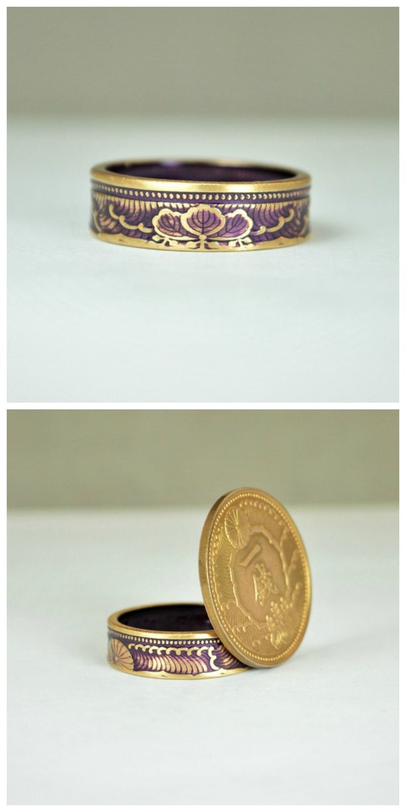 These rings are handcrafted using a rare brass Japanese One Sen Coin. Issued only in 1988 they feature a beautiful wave and cherry blossom design that will be on the outside of the ring. The inside of the ring features the date and issuing authority in Japanese script. You can see the coin these are made from in the first photo.