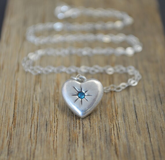 Mothers Necklace, Silver Heart Necklace, Blue Zircon Stone...