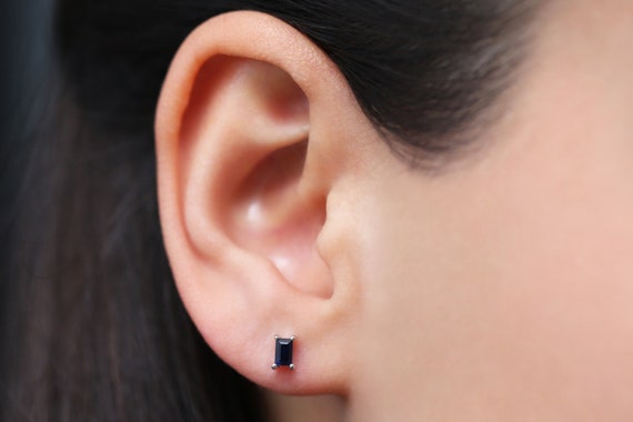 Sapphire Stud Earrings - Baguette Cut Genuine Sapphire Stud Earrings in 14k Gold set in Prongs - Simple Dainty Sapphire Stud Earrings