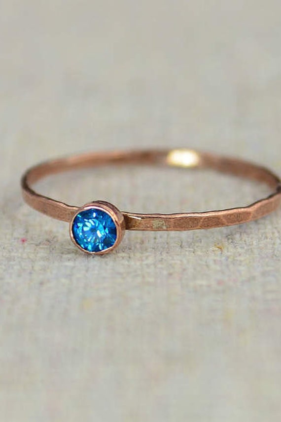 Dainty Copper Blue Zircon Ring, Hammered Copper, Blue Zircon Mother’s Ring, Decembers Birthstone Ring, Copper Jewelry, Blue Zircon Ring by Alaridesign
