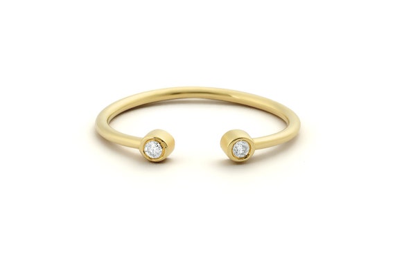 This gorgeous gold ring features two brilliant round cut diamonds. One diamond is set at either end of the open band design. We want your gift to be as unique as the person receiving it so we have three beautiful custom colors to choose from: Rhodium, Yellow Gold, or Rose Gold. Surprise her with a gold diamond duo ring as beautiful and unique as she is.