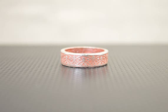 Each ring has a dusty rose nanoceramic coating applied to the inside and outside of the ring. I then remove a portion of the coating from the outside to highlight the beauty of the coin. I then plate the exposed metal in silver to bring out the design. Finally I coat the ring in a clear ceramic. The clad coin has enough copper/nickel in it that untreated metal can be reactive to some peoples skin, so I have chosen to apply the nano ceramic on the ring in a way that will prevent the the possibility of harmless “green finger”. The nanoceramic will wear off over time, however I offer free replating of the ring as needed just pay postage.