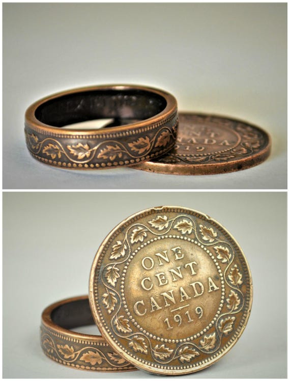 These rings are handcrafted using a copper George V Canadian Large Cent Penny Coin. Issued from 1911-1920, they feature a beautiful vine and ivy design encircled by dots, engraved by Horace Morehen, which will be on the outside of the ring. The inside of the ring features the text “Gregorius V : Dei Gra : Rex Et Ind : Imp" which stands for “George V Dei Gratia Rex et Indiae Imperator,” which means “George V, By the Grace of God, King and Emperor of India.”