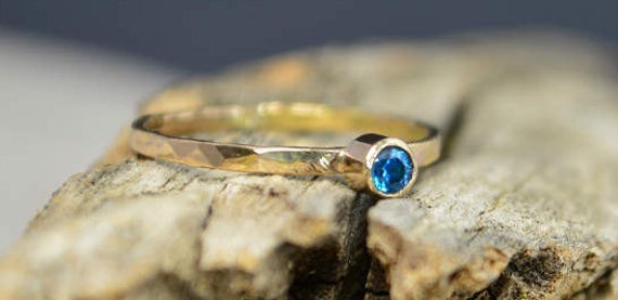 Classic Solid 14k Gold Blue Zircon Ring, 3mm gold solitaire,...