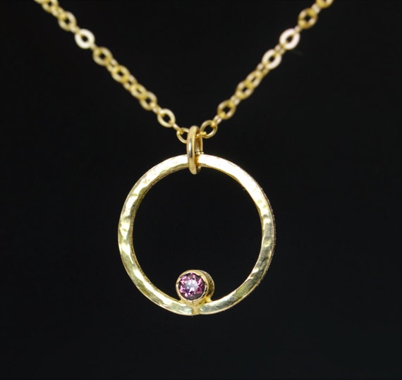 Necklace: Hammered Solid 14k Gold Circle with Alexandrite CZ Birthstone