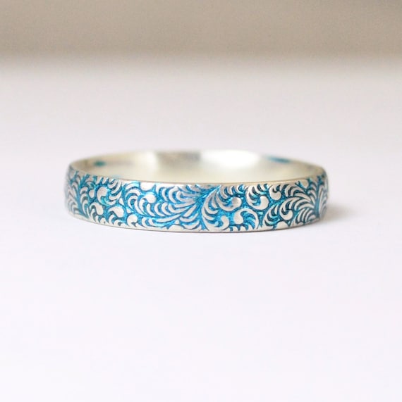 Silver Flower Ring, Floral Band, Swirl Ring, Turquoise Ring, Sterling Silver Ring, Sterling Stack Ring, Silver Band, Romantic Boho Ring by Alaridesign