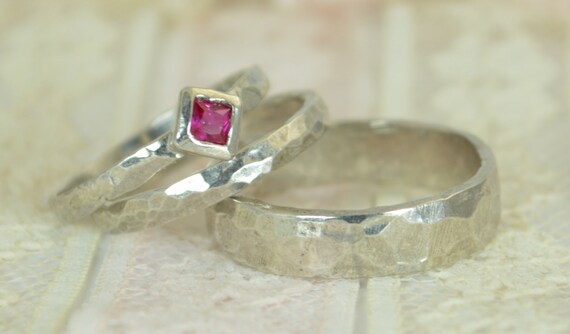 Square Ruby Engagement Ring, 14k White Gold, Ruby Wedding Ring Set, Rustic Wedding Ring Set, July Birthstone, Solid Gold, Gold Ruby Ring by Alaridesign