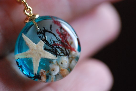Ocean Resin Necklace, Blue Sea Necklace, Mermaid Pendant, Nautical Jewelry, Underwater Necklace, Starfish Necklace, Seaweed Nature Pendant by AlpacaBlue