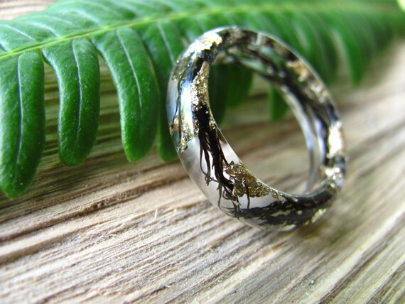 Ocean Resin ring, Mermaid Ring, Black Resin Ring, Summer Sea Ring, Real Algae Ring, Gold Flakes Resin Ring, Thin Rounded Band, Gift for Her by AlpacaBlue